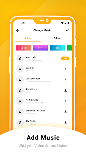 이 서정적 인 비디오 메이커의 가장 중요한 부분은 오프라인 및 온라인 음악을 선택할 수있는 옵션으로 응용 프로그램에서 제공되는 것과는 별도로 노래를 추가 할 수 있습니다. 이 응용 프로그램에는 트렌드를 유지하기위한 핵심이 있으므로이 응용 프로그램을 다운로드하면 최근의 모든 창의 템플릿이 사용되면 사용 중입니다.