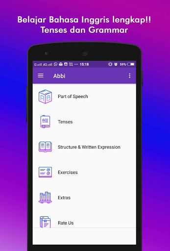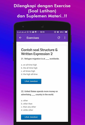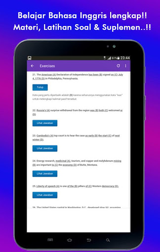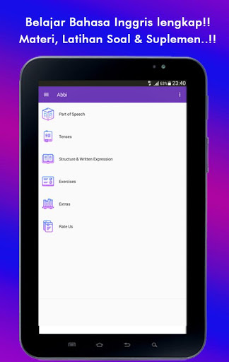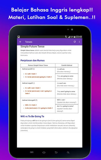 Aplikasi juga dilengkapi dengan Exercise (Latihan Contoh Soal); serta Extras berupa suplemen materi; seperti Daftar Irregular Verb, Daftar Kosakata, dan masih banyak lagi..!!