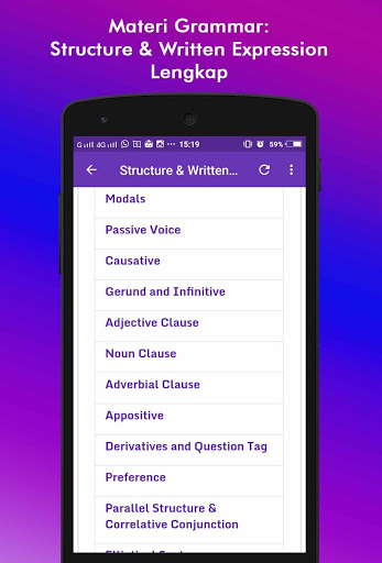 Materi lengkap, dari mulai belajar Part of Speech, Tenses, Grammar, Structure and Written Expression. Materi disusun secara ringkas, lengkap, disertai contoh, dan mudah dipahami.