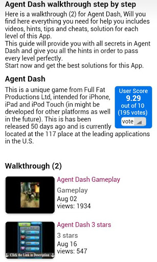 Agent Dash free video walkthrough for all fans of Agent Dash game. Agent Dash is an endless runner game, wherein players are tasked with dodging obstacles and destroying enemy bases. Agent Dash Free app provides the video walkthroughs 2 with detailed images, tips, information, and hints on how to play your best game. Start now and get the best solutions in Agent Dash Free