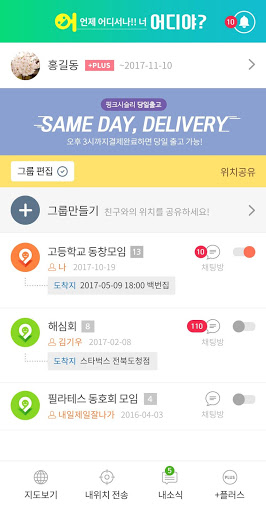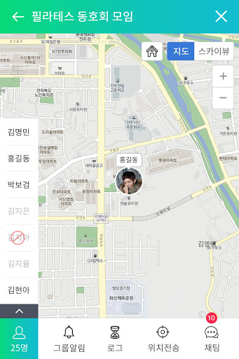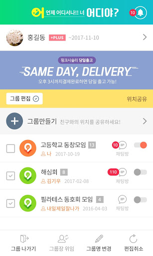어디야를 열어 그룹 친구의 위치를 24시간 연중무휴로 확인하세요.