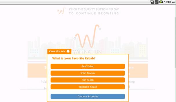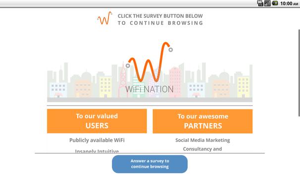 WiFi Nation is a company which aims to provide free WiFi hotspots around the Philippines. The only conditions are: users are required to authenticate with our router using Facebook, and they should answer one survey question for each connection.
