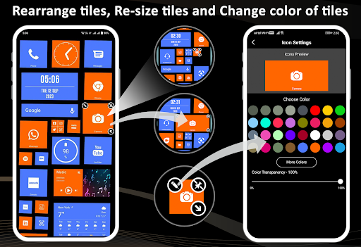 제어 중입니다.타일을 재정렬하고, 폴더를 만들고, 타일을 크기 르며, 원치 않는 타일을 제거하여 홈 화면을 쉽게 사용자 정의하십시오-정사각형 타일 전화기를 연상시키는 직관적 인 드래그 앤 드롭 인터페이스.