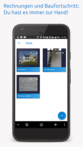 집 건물과 관련하여 인보이스를 받았습니까? 앱으로 사진을 만드는 것만으로 항상 청구서를 보내십시오. 건설 진행 상황을 문서화하고 싶습니까? 새로운 지붕에서 사진을 앱에서 카메라로 사진을 찍고 앱에서 언제든지 검색 할 수 있습니다. 스마트 폰의 붐비는 갤러리에서 오랫동안 검색 할 필요가 없습니다.