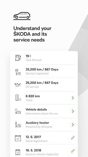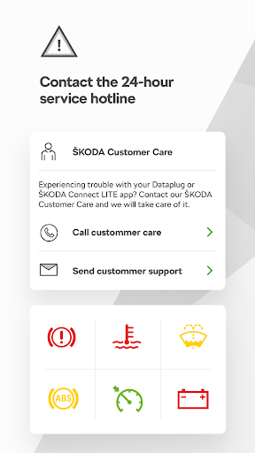 - In the case of a breakdown, you have access with just one click to 24-hour breakdown assistance or the ŠKODA service hotline. If a warning light comes on you can find out what it means in the app.