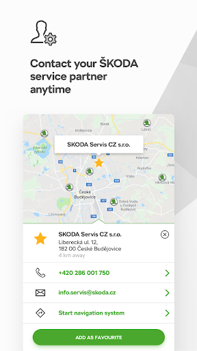 - Shows you the ŠKODA authorised workshops nearby and gives you the option of requesting an appointment. In this way, you can easily stay in contact with your preferred authorised workshop