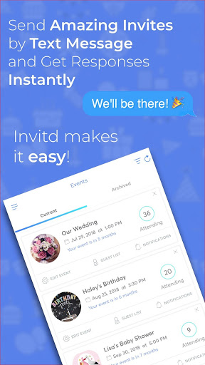 초대장을 보내고 싶은지 여부, 문자 메시지 초대장이 가장 단순한 RSVP 추적기로 RSVP를 무료로 추적하거나 추적 할 수있는 invitd는 그것을 할 수있는 완벽한 이벤트 초대장 메이커 앱입니다!