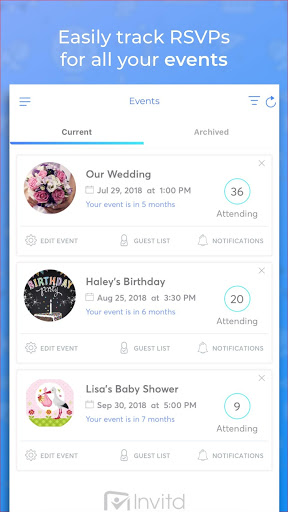 이벤트 주최자, 파티 플래너 또는 웨딩 플래너로 열린 초대, RSVPS 및 손님 수를 추적 할 수 있습니다. 앱 내에서 직접 참석하십시오.