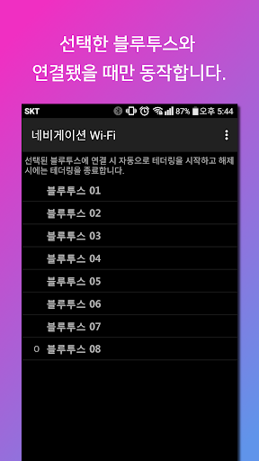 이 앱은 스마트폰과 설정한 기기가 블루투스로 연결되면 핫스팟을 자동으로 켜주는 기능을 하기 때문에 사전에 스마트폰과 연결할 기기를 선택하는 과정이 필요합니다.