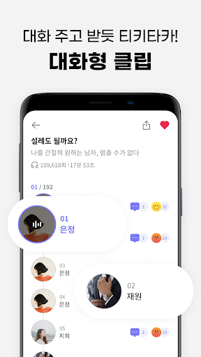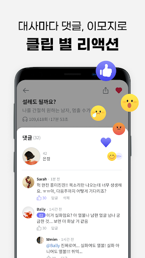 - 리뷰는 리액션으로! 들으면서 대사 별 댓글, 이모지로 리액션을 할 수 있어요.