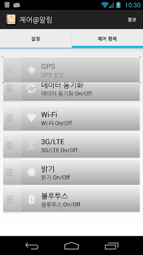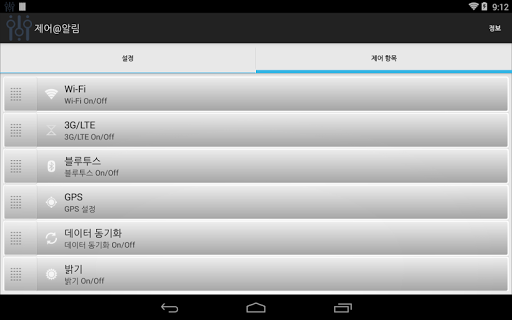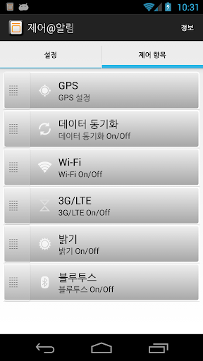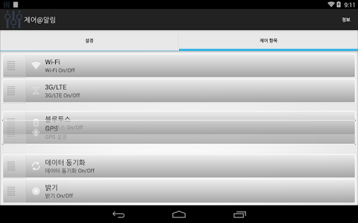 WiFi, 3G/LTE, 동기화 등을 켜고 끌수 있습니다.