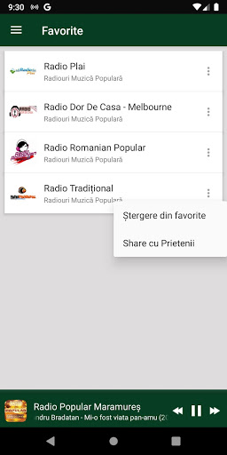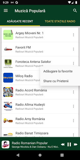 ★ Adăugarea posturilor de radio cu muzica populara favorite din România într-o listă separată pentru vizualizarea lor ulterioară. Pentru adăugare se face clic in partea dreaptă a postului de radio, pe cele 3 puncte, până apare opțiunea de a fi adăugat în lista de radiouri favorite;