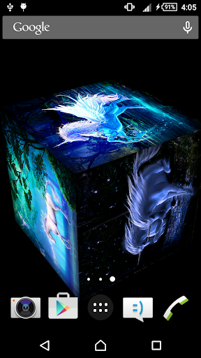 이 유니콘 라이브 벽지는 선택한 이미지의 사진을 보여주는 회전 3D 사진 큐브를 갖추고 있습니다.