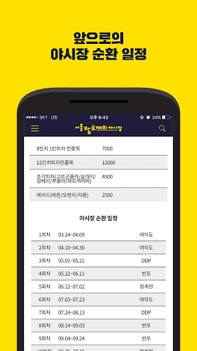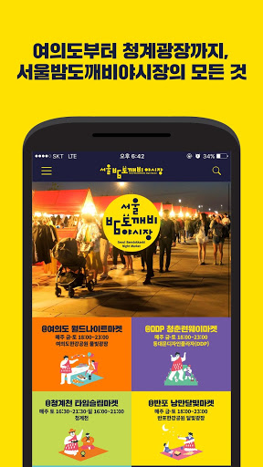서울밤도깨비야시장 앱은 휴∙개장 소식부터 메뉴∙상품 정보, 야시장 상단 순환 일정, 공연 프로그램 등 방문객에게 필요한 정보를 제공합니다. 방문객은 검색을 통해 푸드트럭 음식과 핸드메이드 상품, 야시장 현장 스케치 등 원하는 정보를 더욱 편리하게 찾을 수 있습니다. 이제 서울밤도깨비야시장의 모든 것을 한눈에 확인하세요.