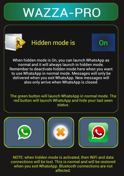 WazzaPro is a FREE app that allows you to access WhatsApp without updating your last seen status. Simply launch WazzaPro when you want to open WhatsApp. The program will prompt you to either launch WhatsApp normally or via the 'hidden' method.