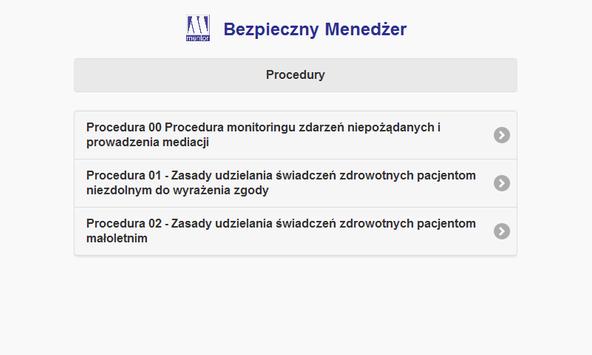 Aplikacja zawiera procedury (schematy) postępowania w zakresach formalno-prawnych, przeznaczone dla personelu medycznego (lekarzy, pielęgniarek i położnych a także ratowników medycznych). Procedury są oparte na obowiązujących przepisach prawa, jednak ich główna zaletą jest prosty język dostosowany do odbiorców bez wykształcenia prawniczego. Prowadzą odbiorcę krok za krokiem wprost do konkretnych czynności: wpis do dokumentacji medycznej, konsultacja, przekazanie informacji pacjentowi itp. Procedury są aktualizowane wraz ze zmieniającym się stanem prawnym.