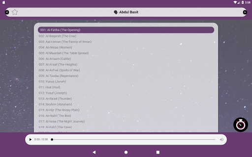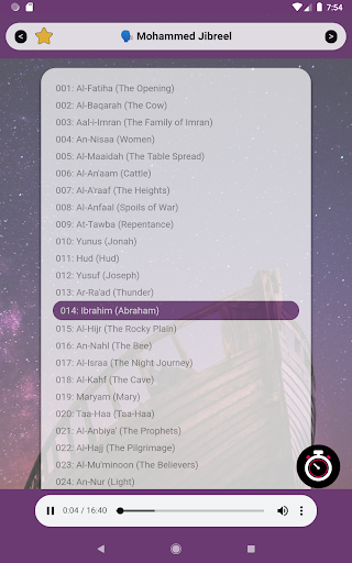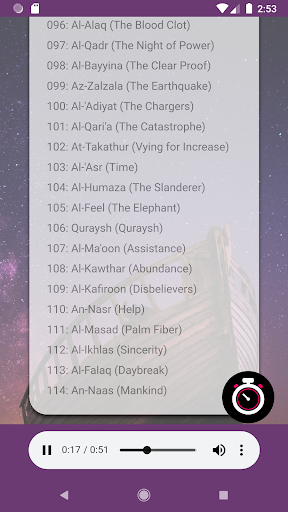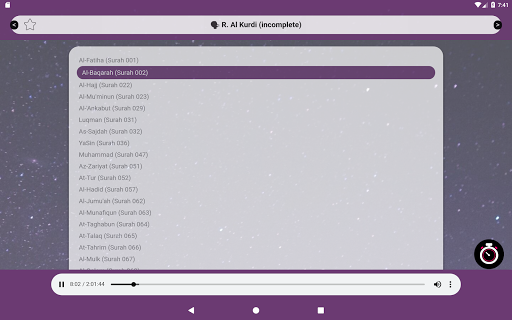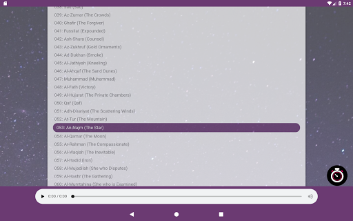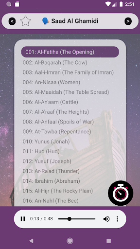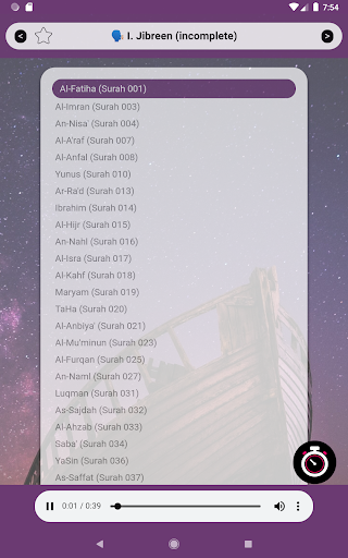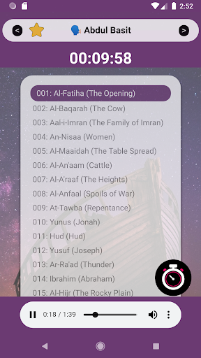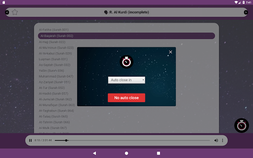 - Auto play feature - it'll auto-play from one surah to the next and continue to play until the timer finishes/you stop it