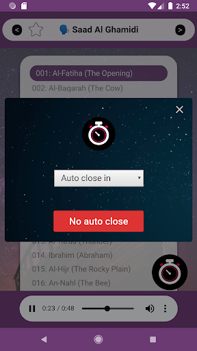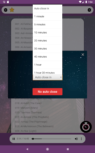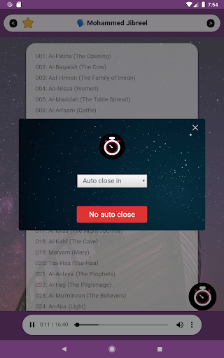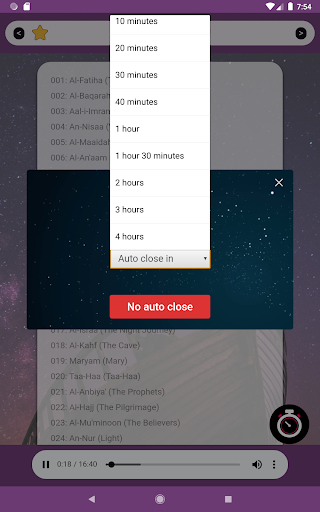 - Auto off timer function - The app will automatically stop and close after the time you set. Perfect for easy listening to the Quran to help you/your child fall asleep.