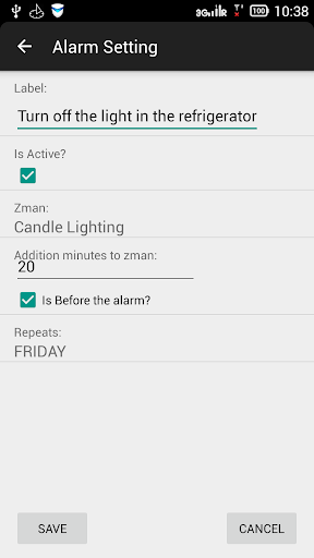 For example, you can tune in every Friday 20 minutes before candle lighting time, and alarm will alert you "turn off the light in the refrigerator".