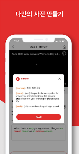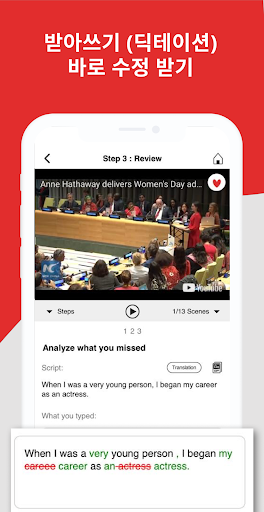 리뷰: 받아쓰기 수정받기, 영어와 한국어로 자막 보기, 설명보기, 모르는 단어, 표현 찾아보고 저장하기