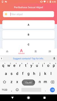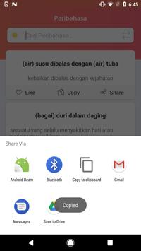 - Copy, pengguna bisa menduplikat peribahasa dan artinya.