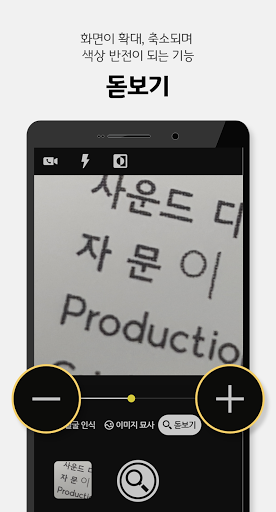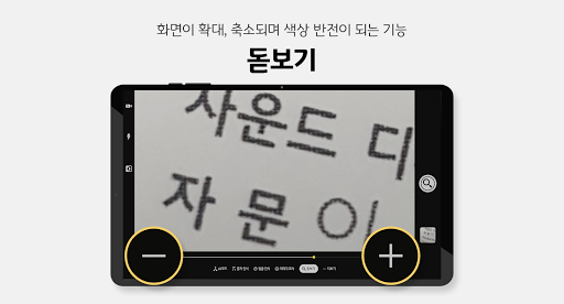 돋보기 기능 - 카메라의 줌 기능을 통해서 사물이나 문자가 확대/축소 및 색상반전이 됩니다.