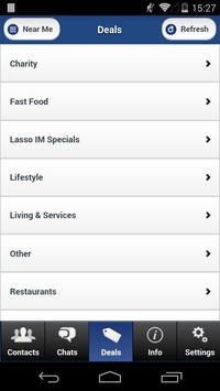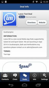 Lasso IM is a social media application that allows users to receive information and deals from businesses within their selected 'lasso'. The 'lasso' distance is controlled by the user and ranges from 0-50 miles. It combines both the traditional methods of advertising with 'real-time', hyper advertising.