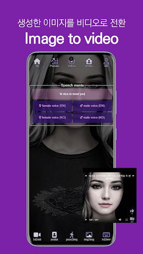 당신이 만든 작품의 생명을 불어넣는 기능입니다. 해당 기능을 통해 당신이 만든 작품의 주인공이 살아 움직이며 말을 할 수 있습니다. 가상인간 기능과 마찬가지로 한/영 AI 보이스를 선택할 수 있습니다.