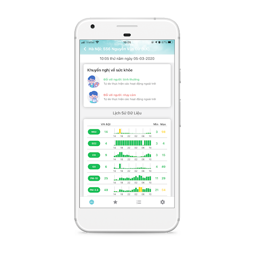 - Hiển thị chỉ số chất lượng không khí (AQI) theo giờ và ngày hiện tại; cung cấp biểu đồ diễn biến giá trị AQI của các giờ trước, ngày trước; đưa ra các khuyến nghị về sức khỏe tương ứng với tứng giá trị AQI;