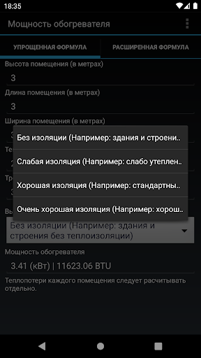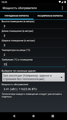 공식에 따라 실내의 부피, 원하는 온도 차이를 고려하여 방을 가열하는 데 필요한 히터의 전력 계산 : v x t x k = kcal/hour, 여기서 :