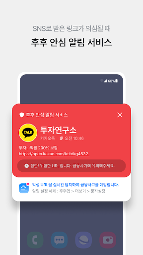 문자에 포함된 URL을 분석하여 스미싱 위험성을 탐지합니다.