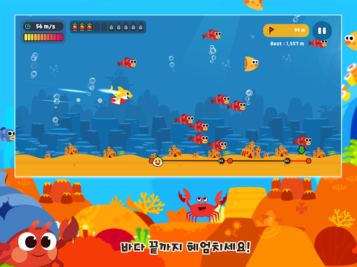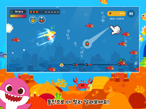 - 아기상어를 멀리까지 날려 보내요! 바닷속 친구들을 만나면 좋은 효과를 획득할 수 있어요. 화면을 손가락으로 그어 친구들에게 닿아 보세요.
