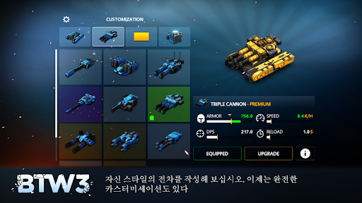 대규모의 전차 전투 세계는 당신을 기다리고 있다. 스킬을 높이고 자신의 전차를 마음대로 조절해 보십시오: 미사일 발사기, 레이저, 레일건을 포함한 무기 선택, 색깔 변경 가능.