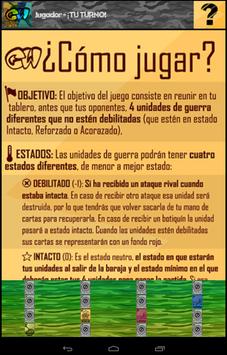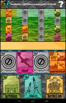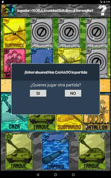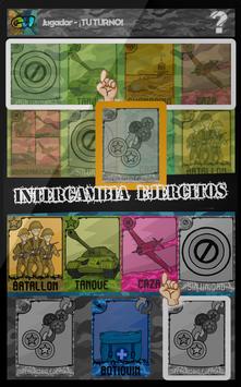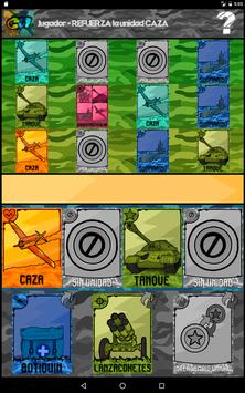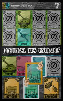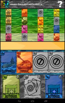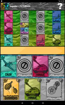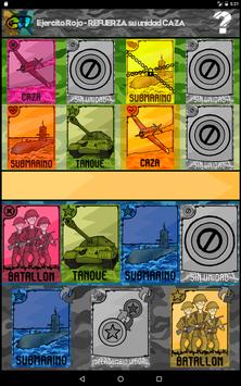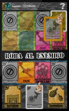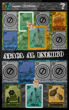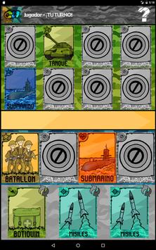 * WEAPONS: They are composed of the letters of GRANADAS, ROCKET LAUNCHER, TORPEDOS, MISSILE and MULTICOLOR ARM. With these cards you can weaken the state of the rival units by throwing them on them. The GRANADAS will affect the BATTALION and MULTICOLOR units. The ROCKET LAUNCHER will affect the TANK and MULTICOLOR units. The TORPEDOS will affect the SUBMARINE and MULTICOLOR units. The MISSILES will affect the HUNTING and MULTICOLOR units. The MULTICOLOR GUN may affect any type of unit. Remember that you can not throw weapons on rival units that are ARMORED.