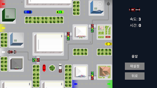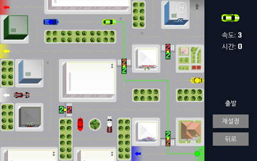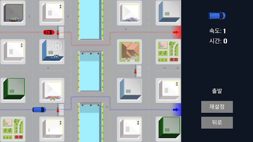 이것은 고속도로나 개방도로가 아니라는 것을 잊지 마십시오: 거리와 모퉁이, 신호등들이 가득한 복잡한 도시교통망이므로 모든 세부사항에 신경을 써야 합니다. 현장에 있는 모든 차들을 몰고 경로를 찾아 출구로 나와야 합니다. 각 차량에 대한 경로를 그리고 "실행"을 누르십시오.