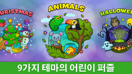 – 동물, 공룡, 동화, 바다, 직업, 간식, 사탕, 우주, 크리스마스, 핼러윈 등 흥미로운 주제에 관한 108개의 교육용 퍼즐이