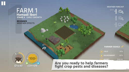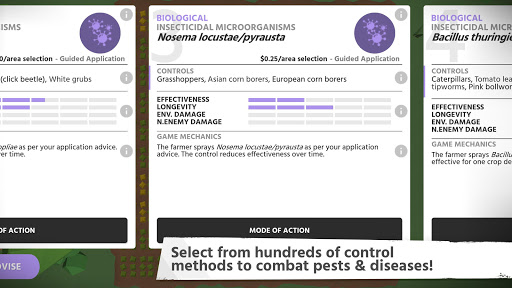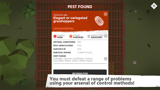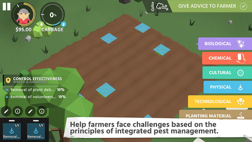 Disclaimer: The pests and diseases and the control methods are modelled on real data, however this game is not a manual on how to grow crops or a replacement for training from an expert. Whilst every attempt has been made to keep the simulation based on reality, please remember that the spread and damage models of the pests and diseases are for educational purposes only and may not reflect the experiences of farmers in all countries. Some of the methods in this simulation may not be appropriate or available in every country. Moreover, some of the chemicals mentioned are highly hazardous and are included for learning purposes only.