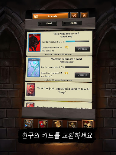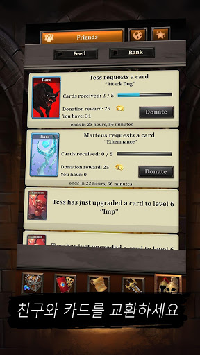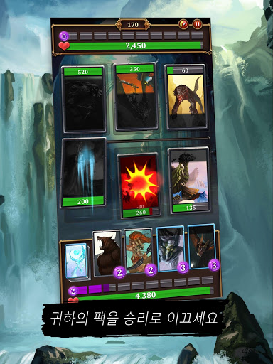 독특한 실시간 반전이 있는 마법으로 가득하지만, 4가지의 희귀한 새 카드를 잠금해제하는 것과 경쟁적인 리그에서 상대방과 싸우고 신화 속에 나오는 야수와 마법으로 가득한 스릴있는 작전을 수행하는 등 트레이딩 카드 게임의 모든 공통적인 특성을 모두 갖춘 판타지 카드 게임입니다. 서사적인 드래곤, 엘프 및 마법사와 충돌하며, 가장 강력한 데크를 만들면서 의자 끝에 앉게 만들 정도로 긴장감이 넘치는 유일한 게임입니다. 이 장르에 처음 입문하는 초보자들에게는 쉽고, tcg/ccg게임에 익숙한 사용자들에게는 도전적인 게임입니다. 미니언들을 서사적인 전투에 투입하여 상대편의 군사력을 말살시키세요.