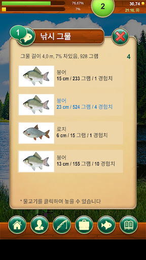 - 저수지에서 낚시 장소를 변경하려면 낚싯대를 제거하고(화면에서 두 번 클릭) 손가락으로 화면을 옆으로 이동합니다.