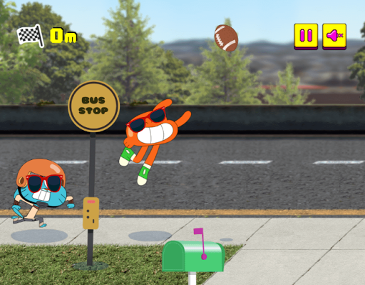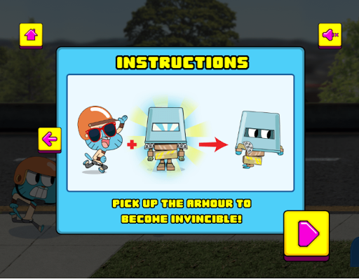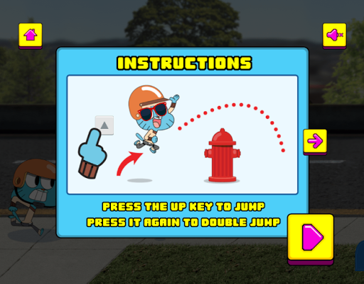 “up” to jump over the bicycles, the pots, the cereal boxes, and all the other objects that stand in Gumball’s way. Double tap on it to perform a double jump if the objects are too tall. Be careful not to hit your head in the objects that are tied up above the street. If you come across some cardboard barriers, Tap
