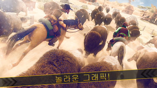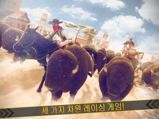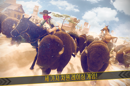 당신의 말을 안장 당신의 박차를 조정하고 화가 버팔로 당신이 당신의 말 떨어지지 만들기 위해 시도하는이 놀라운 레이스에 몰두.