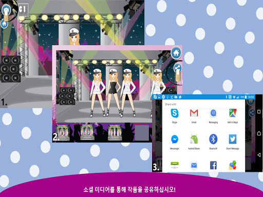 좋아하는 아이돌을 만들고, 현재 유명한 아이돌 그룹에서 영감을 얻은 옷을 선택하고, SNS를 통해 자신의 작품을 공유하십시오.