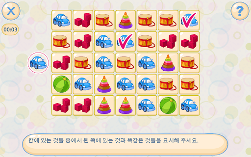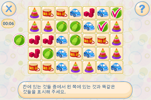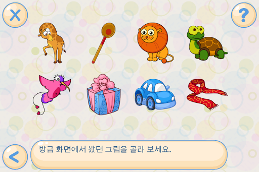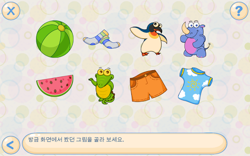 5. "그림 외우기" - 화면에 나오는 그림을 기억해 두었다가 어떤 그림이 있었는지 알아 맞추는 과제입니다. 아이의 기억력 개발에 효과가 있습니다.