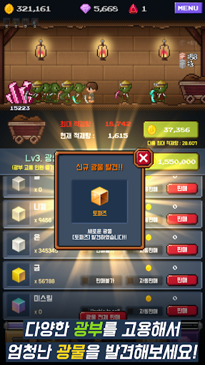 ※노가다 주의※ ★ 세상에 없던 희귀한 광물을 찾아서 ★ - 직접 광산을 운영해서 세계에서 제일가는 부자가 되어보세요! - 광산을 성장시키며 곳곳에 숨어있는 보스들을 무찌르세요! - 광산 깊은 곳에 숨어있는 희귀광물을 찾아 진귀한 검을 만들어보세요! ---- 개발자 연락처 : 821042455421