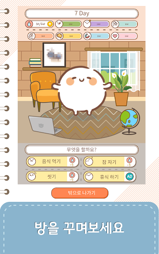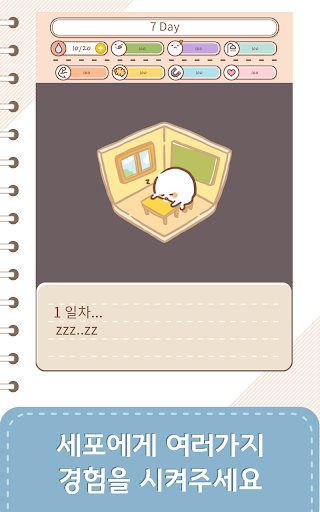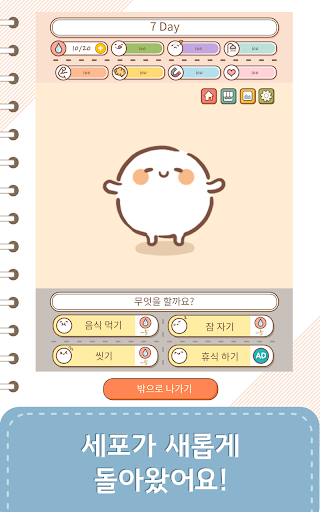 ***글로벌 200만 유저들이 즐긴 "세포와 나의 49일" 그 두번째 이야기가 시작됩니다.*** - 49일간 나만의 육성방식으로 세포를 키워주세요. -새로운 대화 이벤트가 등장합니다. 대화 분기에 따라서 받는 보너스가 다르니 신중해 주세요. -새롭게 방꾸미기 시스템이 등장합니다. 다양한 엔딩을 모으고 나만의 방을 꾸며보세요. ---- 개발자 연락처 : 82-10-9169-9731