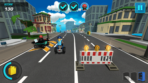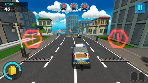 Watch the PLAYMOBIL city whizz by as you chase the robber through the streets, avoiding traffic cones, road blocks and spike strips.