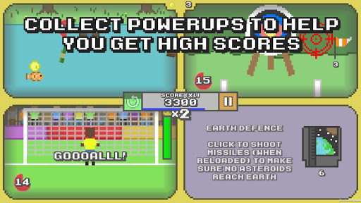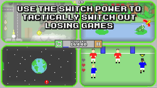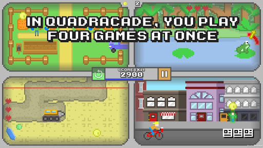 In Quadracade, you will play four addictive arcade games at once. Keep an eye on them all because when you die in one, it's game over. Watch out for new games being switched in and the game speeding up when you level up. Use the switch power to swap out games where you are on low lives, so you can tactically stay in the game.