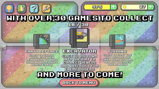 Collect coins within the game to buy more game cartridges from the shop. You start out with 8 different arcade games to play but there are a total of 30 arcade games to add to your collection (and more to come!).