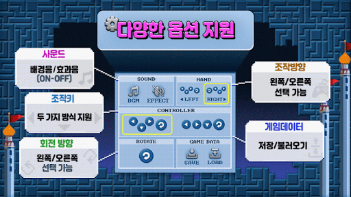 이것은 누구나 쉽게 즐길 수있는 고전적인 퍼즐 게임입니다. 다양한 미션과 다양한 옵션으로 게임을 재미있게 편리하게 해줍니다. 레벨 모드, 아케이드 모드, 클래식 모드 및 멀티 모드 4 개의 모드가 있습니다. 14 종류의 블록이 있습니다. 좋아하는 블록을 수집하여 선택하십시오.