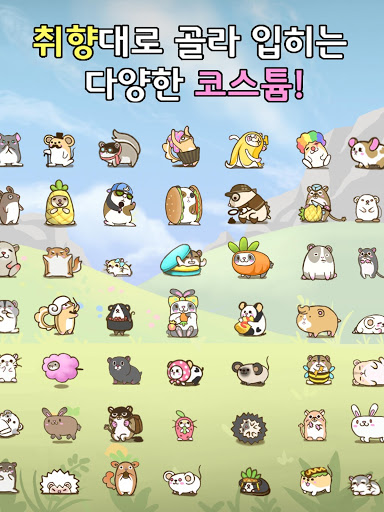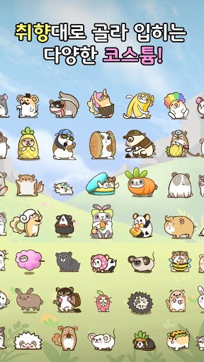 총 15마리의 동물을 모아보세요. 생쥐, 팬더마우스, 다람쥐, 로보로브스키, 골든햄스터, 마우스, 드워프햄스터, 기니피그, 고슴도치, 저빌, 날다람쥐, 토끼, 래트, 친칠라, 카피바라 친구들을 키울 수 있습니다.